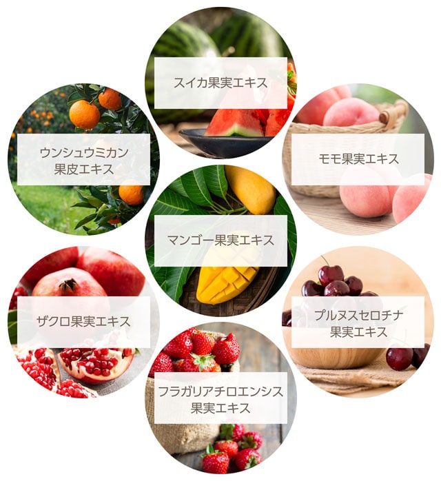 * 保湿成分:スイカ果実エキス、ウンシュウミカン果皮エキス、マンゴー果実エキス、モモ果実エキス、ザクロ果実エキス、プルヌスセロチナ果実エキス、フラガリアチロエンシス果実エキス