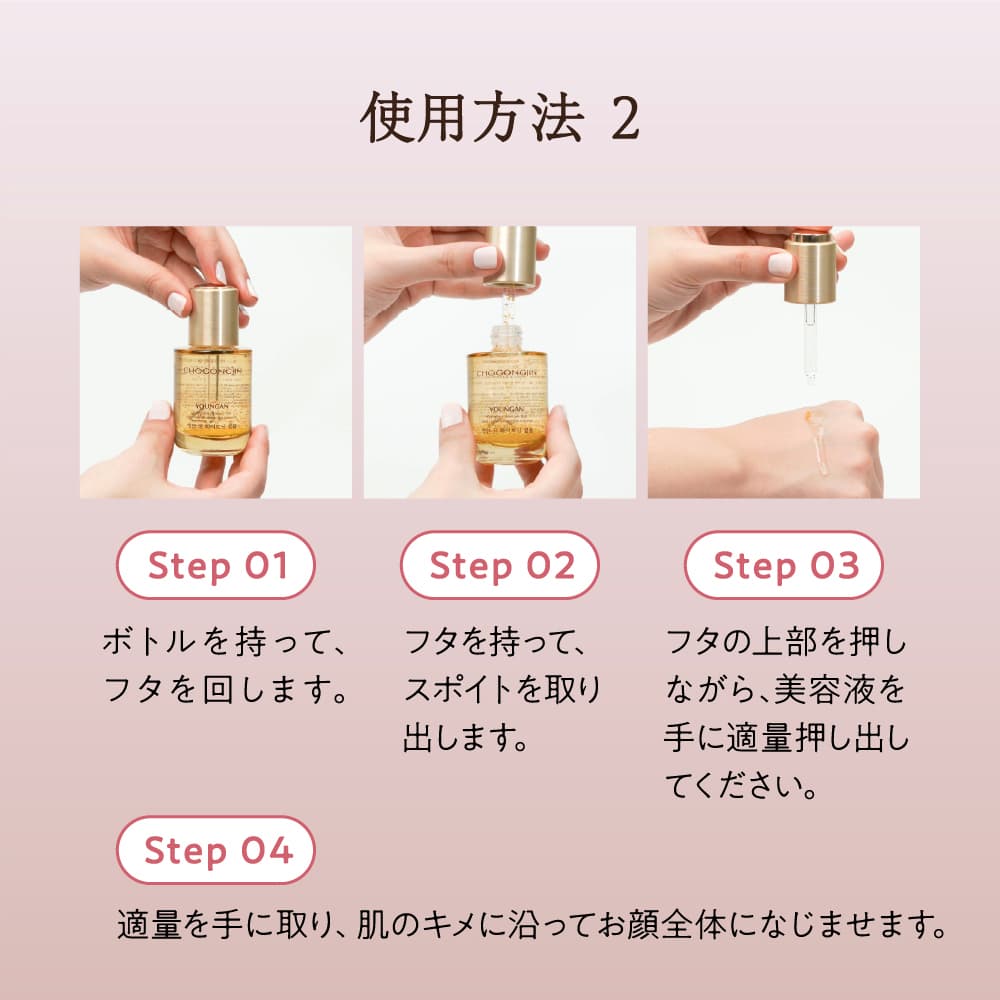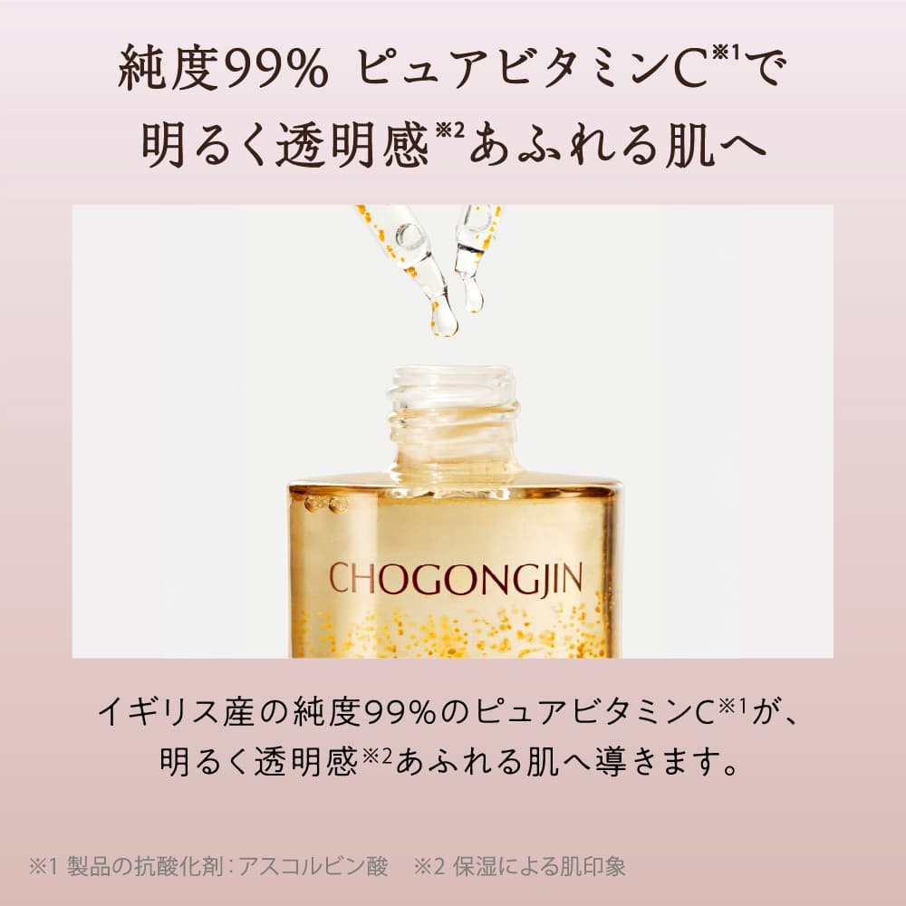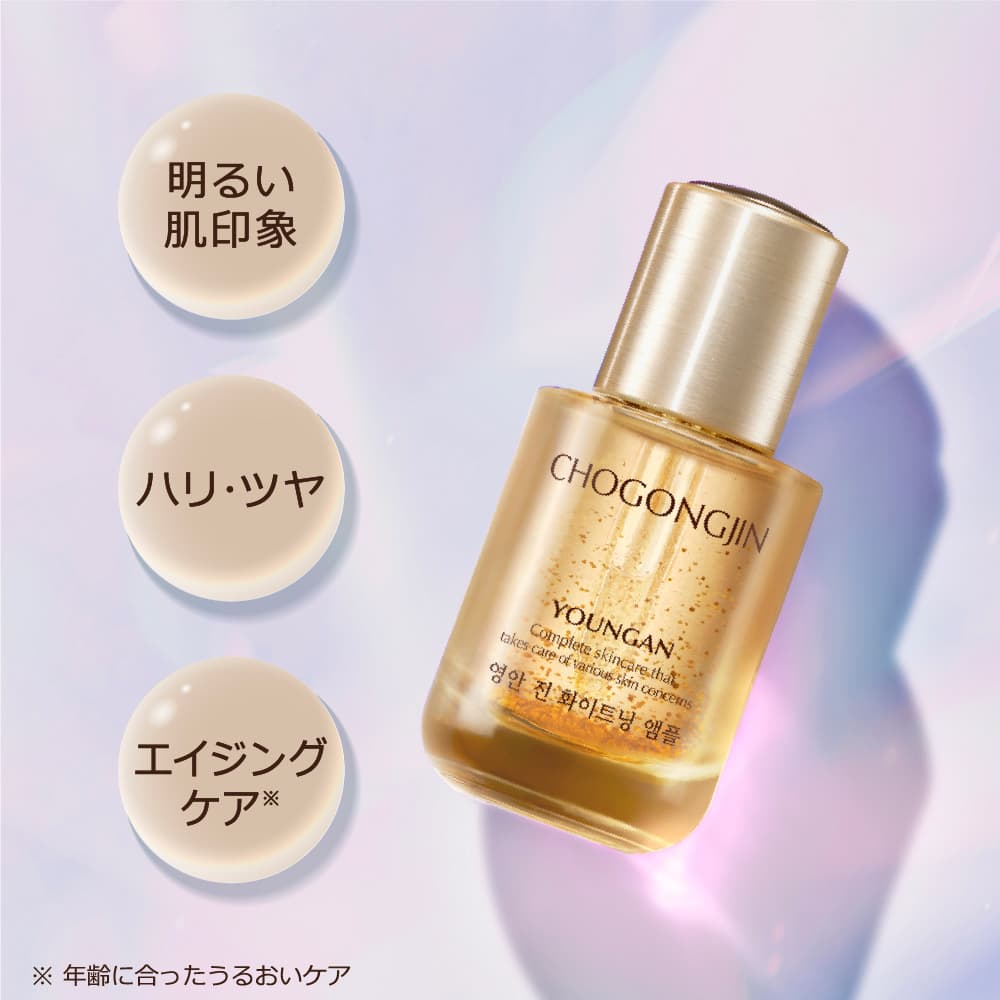 このチョゴンジン独自処方のスキンケア効果で、ツヤ・ハリ不足、くすみ*1、肌荒れ*2など、エイジングによる肌悩みに集中的にアプローチします。