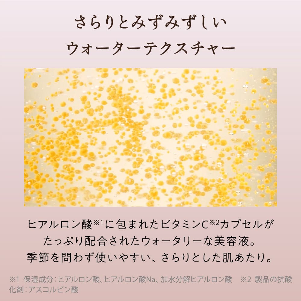 ヒアルロン酸*1に包まれたビタミンC*2カプセルがたっぷり配合されたウォータリーな美容液。季節を問わず使いやすい、さらりとした肌あたり。