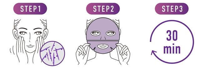 ③ 約30分後~、有用成分が角質層に浸透しマスクが半透明~透明になったらはがし、肌に残っている美容液をパッティングしてなじませます。