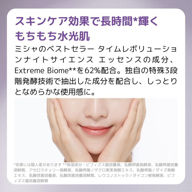ミシャのベストセラー“タイムレボリューション ナイト サイエンス エッセンス”の成分、Extreme Biome*を62%配合。