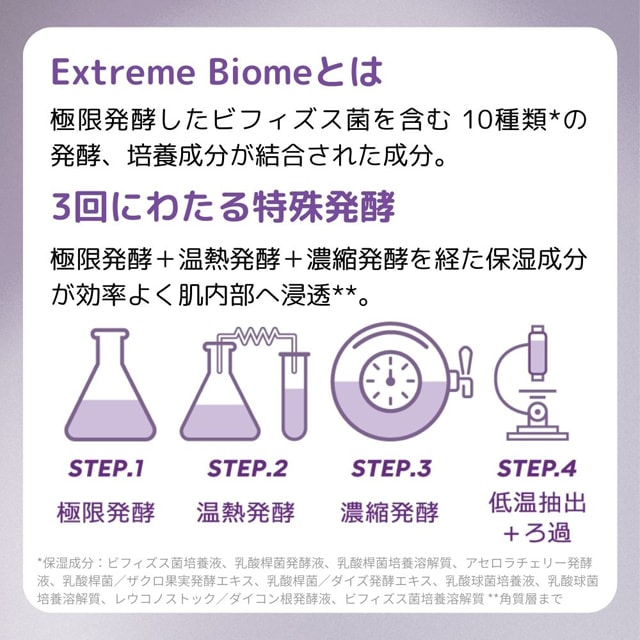 *1 すべて保湿成分:ビフィズス菌培養液、乳酸桿菌発酵液、乳酸桿菌培養溶解質、アセロラチェリー発酵液、乳酸桿菌/ザクロ果実発酵エキス、乳酸桿菌/ダイズ発酵エキス、乳酸球菌培養液、乳酸球菌培養溶解質、レウコノストック/ダイコン根発酵液、ビフィズス菌培養溶解質