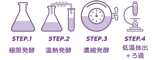 極限発酵+温熱発酵+濃縮発酵で計3回発酵させた原料を圧縮ろ過して抽出