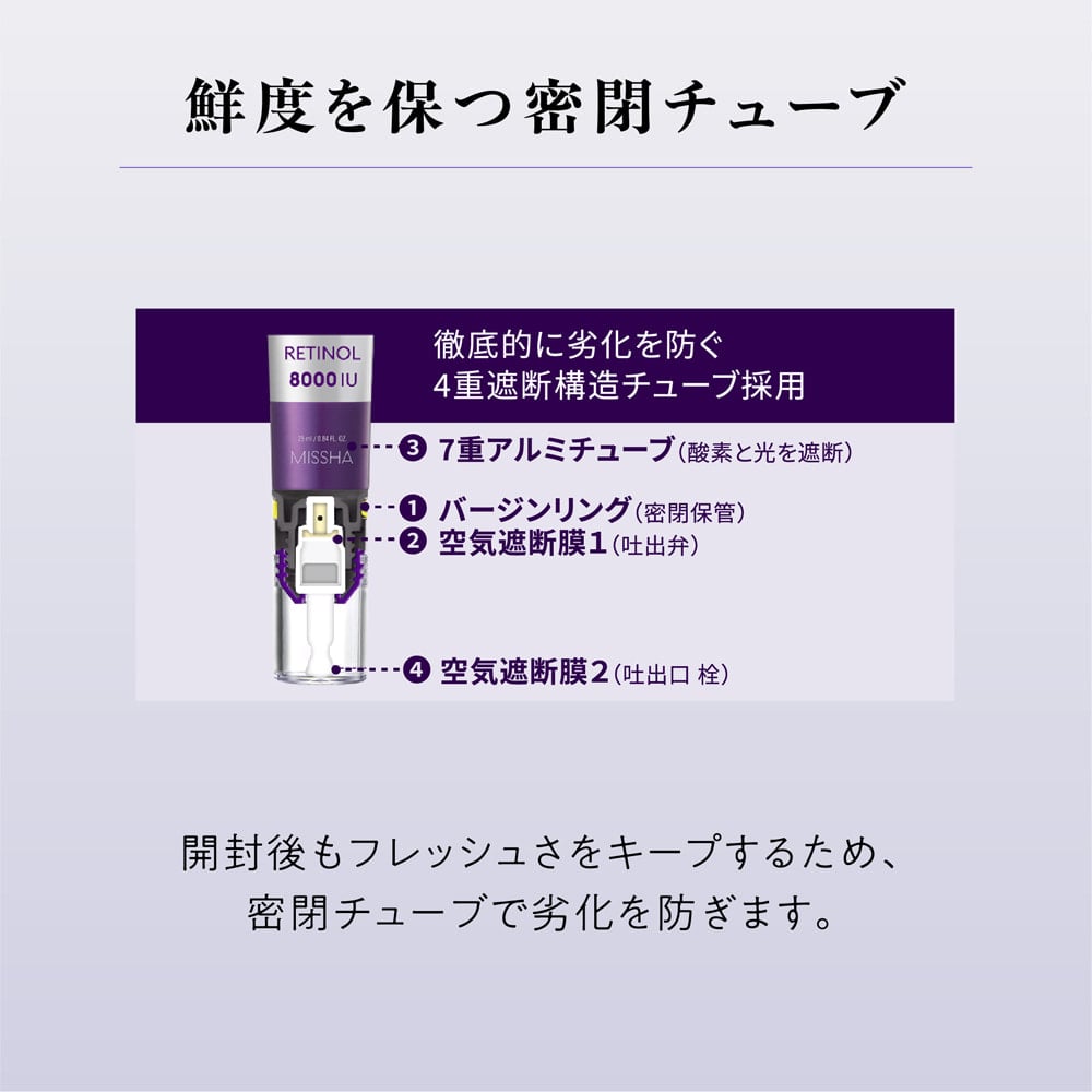 密閉チューブで開封前だけでなく、開封後のフレッシュさにまでこだわった、有用成分集中型のミシャ最高濃度レチノール*1夜用クリーム。
