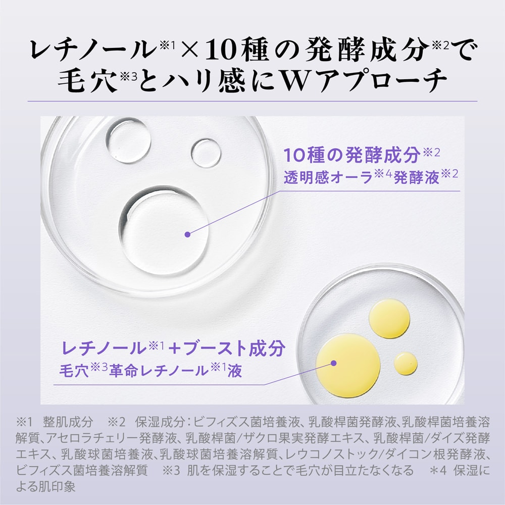 10種の発酵成分*2を配合した「透明感オーラ*4発酵液*2」がシナジー効果を発揮。