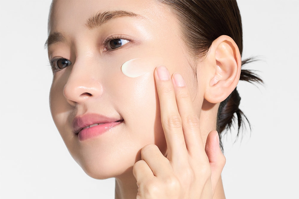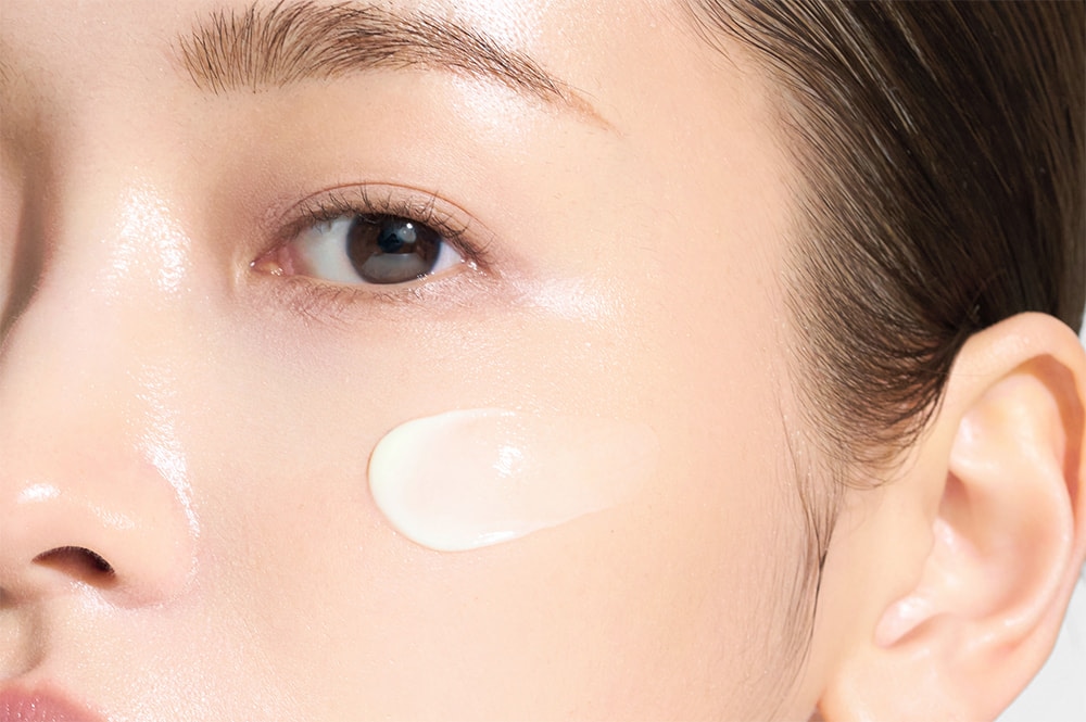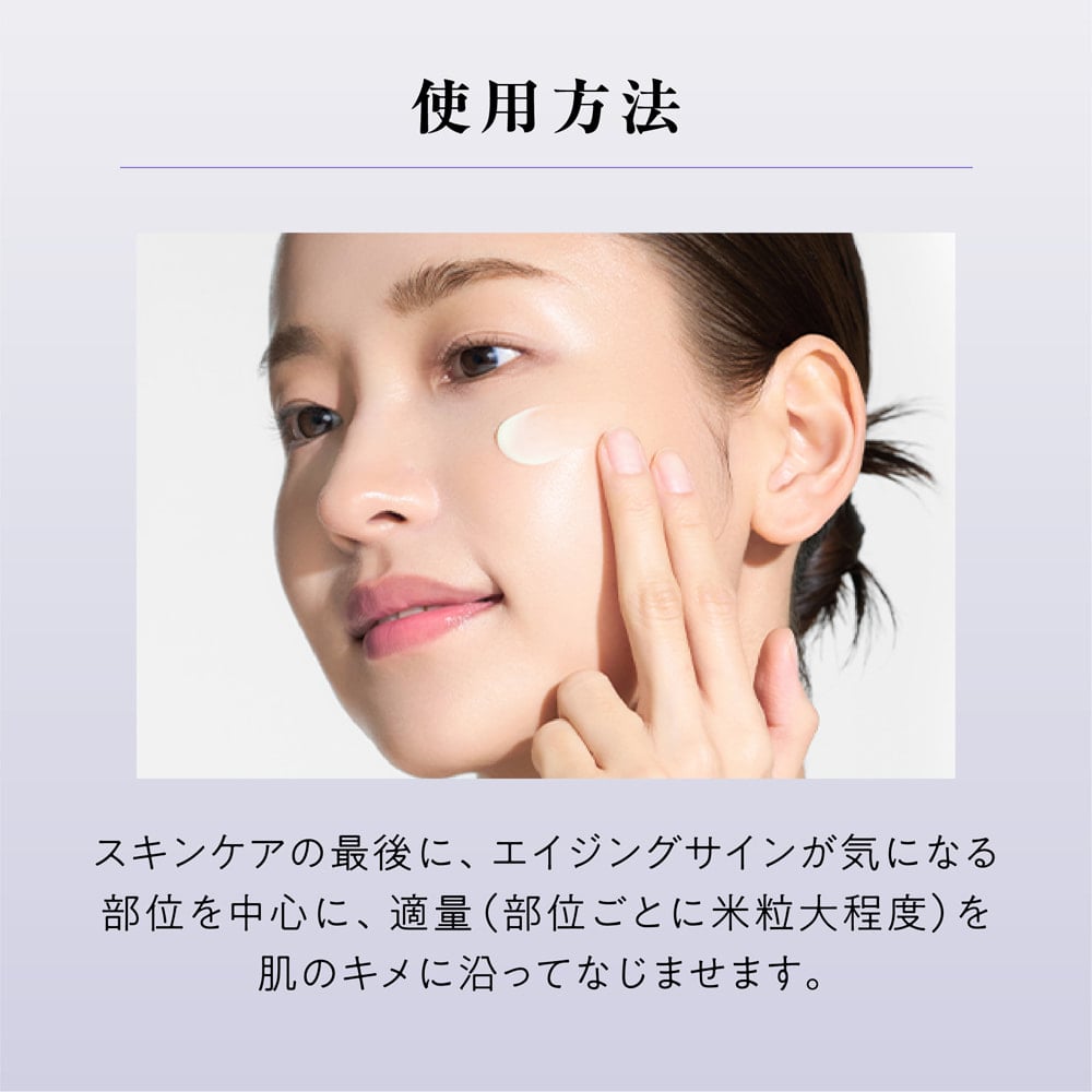 スキンケアの最後に、エイジングサインが気になる部位を中心に、適量(部位ごとに米粒大程度)を肌のキメに沿ってなじませます。