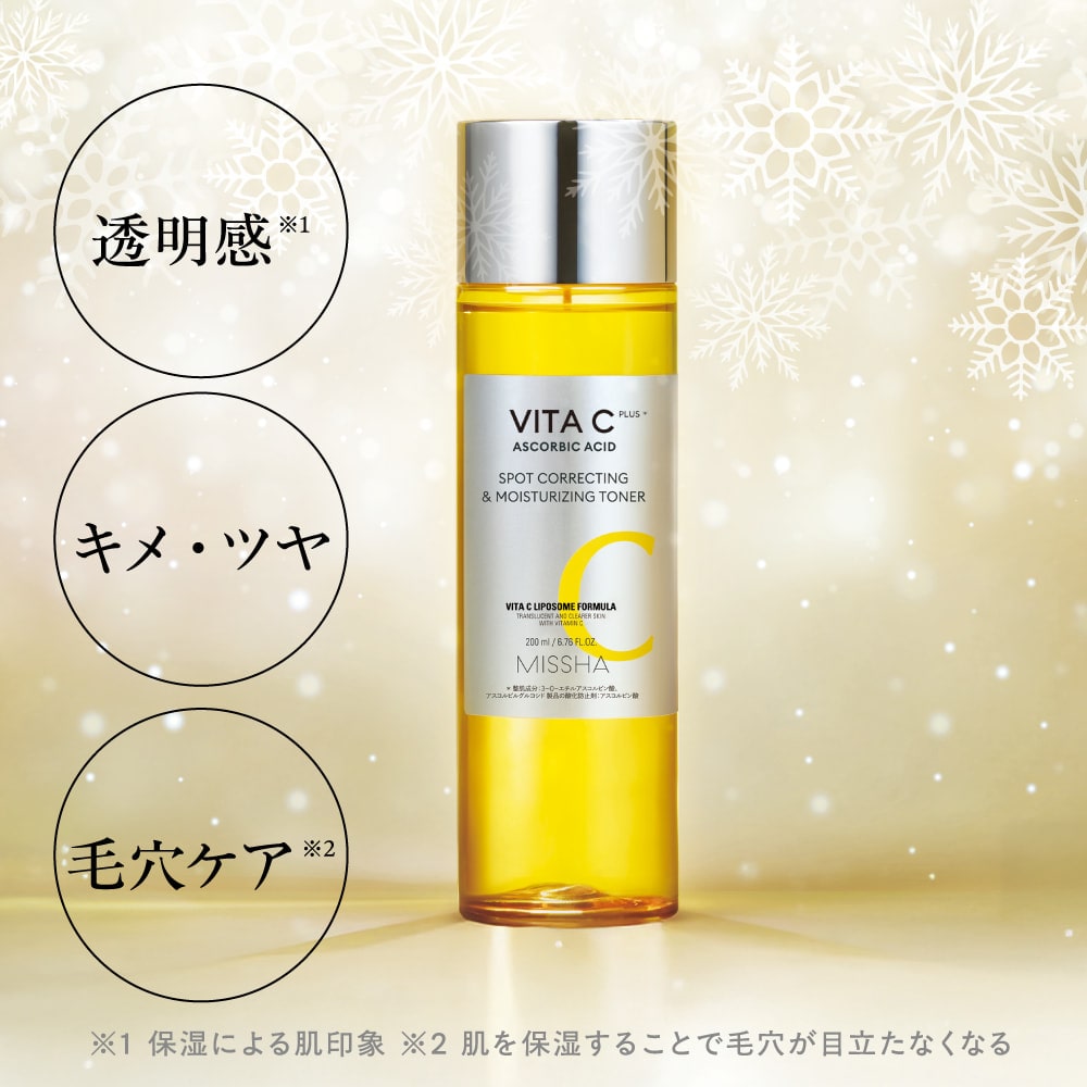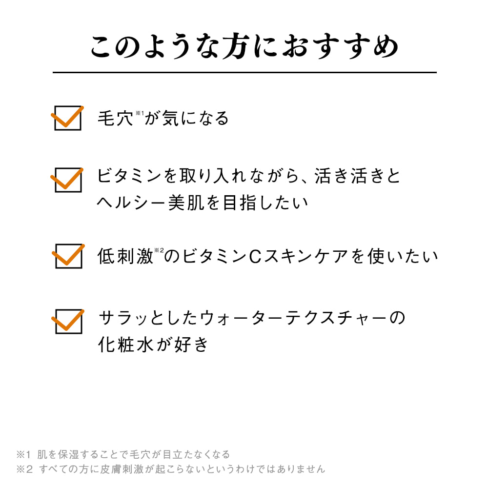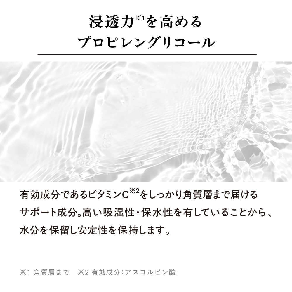 - *1 構成成分:(製品の酸化防止剤)アスコルビン酸、(整肌成分)3-O-エチルアスコルビン酸、アスコルビルグルコシド