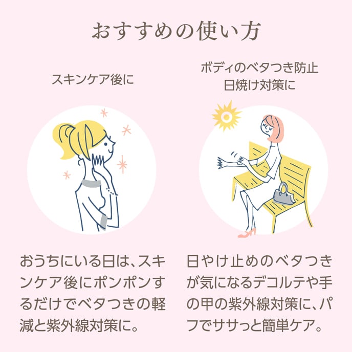 グロウ スキンバームまたはグロウ スキンバームミストを化粧下地としてご使用かつUV効果がないファンデーションやフェイスパウダーをご使用の場合、日焼け止めを併用してください。 - (4)ファンデーション