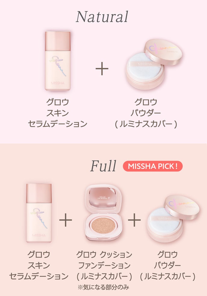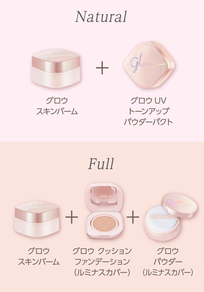 ※日焼け止めを併用いただく場合、グロウスキンバーム・グロウスキンバームミストは日焼け止めの前にお使いください。グロウパウダー(ルミナスカバー)は、日焼け止めの後にベースメイクの仕上げとしてお使いください。