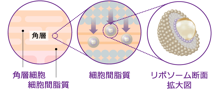 さらに、角層内でバリア機能を発揮する細胞間脂質になじみやすい成分構成でリポソーム化し、2層構造に。2層の成分が時間をかけてほどけていくことにより、肌負担が少ない状態で、レチノール*1をゆっくりと効果的に肌*3へ届けます。